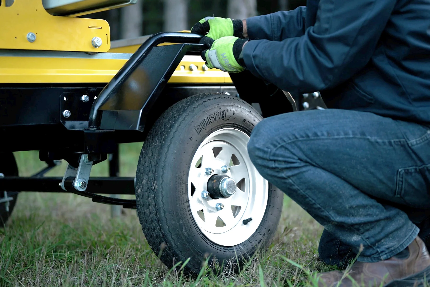 Make your Frontier OS35 sawmill mobile for easy towing through your woodlot and directly to your sawing site. Once you arrive, effortlessly level your log deck using the convenient adjustable support jacks. Package includes the all-steel and powder-coated sub-frame structure including connecting brackets, axle, two 12” (30.5cm) wheels, quick-disconnect drawbar, running lights, wiring harness, safety chains, 2” (50mm) coupler and 6 support jacks.